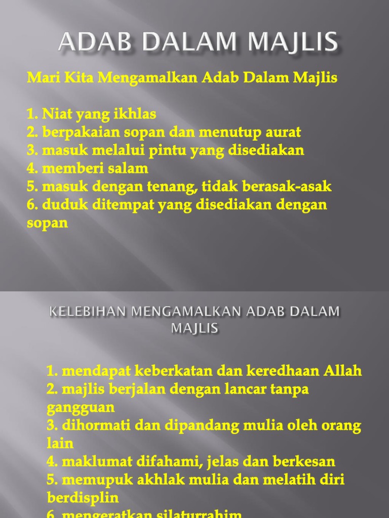 Adab perlu dijaga agar ilmu yang didapatkan bisa bermanfaat bagi kehidupan dan meninggalkan perbuatan sia-sia. ADAB-ADAB KETIKA BERADA DI DALAM MASJID 10. Majlis adalah satu pertemuan beramai-ramai untuk meraikan sesuatu.